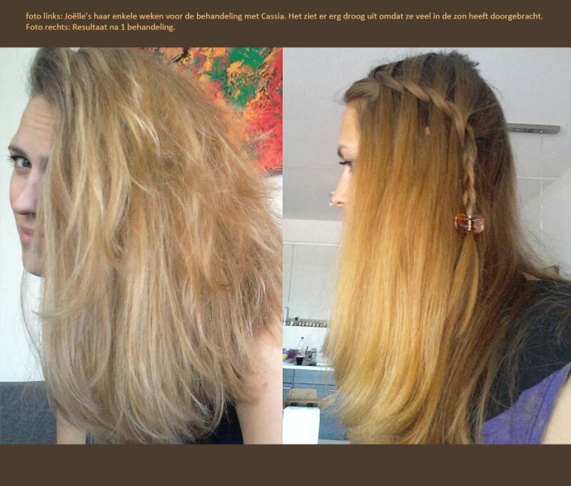 Links: Joëlle's haar enkele weken voor de 1e Cassia behandeling. Rechts: na de 1e Cassia behandeling.