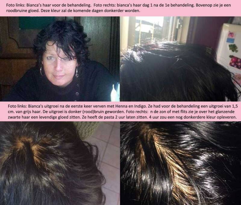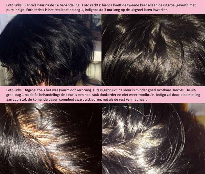 Bianca houdt de uitgroei bij. Wanneer ze weer een uitgroei heeft, verft ze alleen de uitgroei met pure henna en daarna weer met pure indigopasta (1-2x, afhankelijk van resultaat).