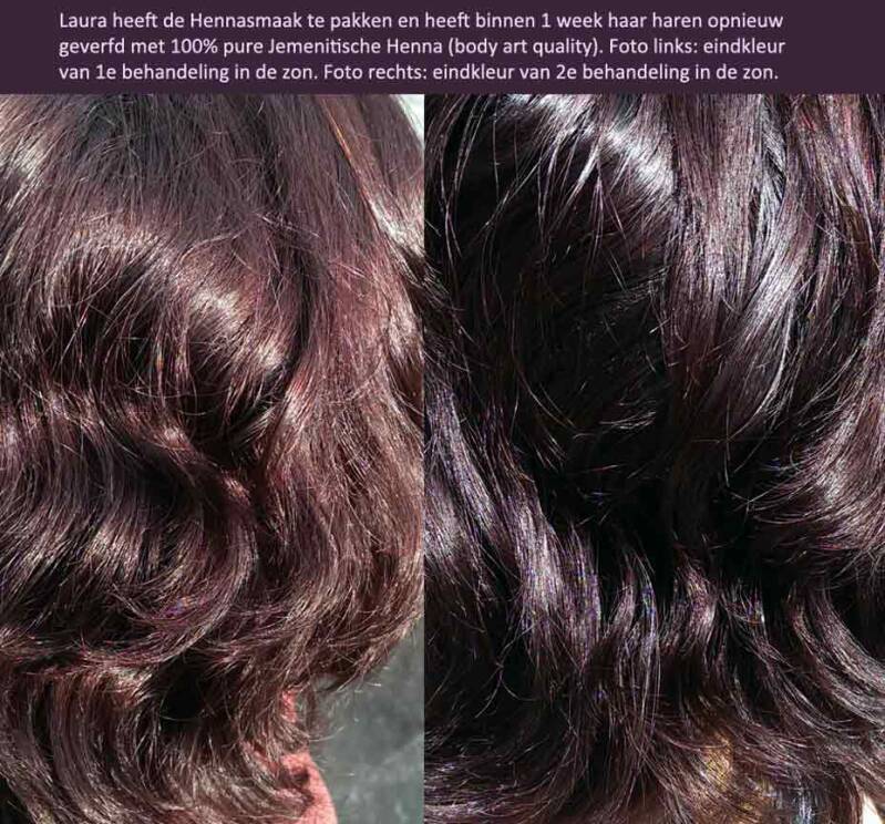 Laura schrijft: "Nadat ik jouw mailtje gisteren had ontvangen dat mijn haar zuurstof nodig heeft, gelijk mijn haar los gedaan.En gisteravond een uur in het bos gewandeld, nou meer zuurstof kan mijn haar niet krijgen, dacht ik zo. Ik zie wel zeker het verschil, mijn haar is nou wat donkerder en is nou een mooie diepe kleur. Mijn haar is super mooi, hahaha. En heb het gevoel dat mijn haar nog mooier gaat worden :) Vandaag is mijn haar los, dus kan weer wat zuurstof slurpen. Ik ben nog steeds heel erg happy. Het glanst mooi! Heb wat foto's toegevoegd, dan heb je keus, haha. Ik hoop met de foto's die ik heb gestuurd, mensen zien dat het niet "scary" is en dat het heel mooi wordt! Ben nou bezig om mijn moeder over te halen om ook met Henna te verven :) Als ze ziet dat deze kleur langer mooi blijft en veel gezonder is dan de chemische verf, dan moet ze wel met Henna verven :-) "