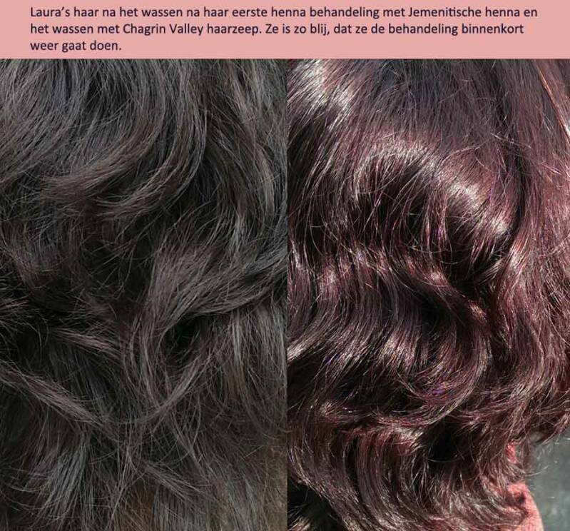 Want haar grootste angst was dat het haar misschien te donker zou worden. Ons advies voor Laura's haar is geweest: zolang als mogelijk is! Zeker als je de prachtige hennakleur op je haar wilt zien (donker haar), is langer beter dan kort. Hoe langer, hoe meer kleurmoleculen in het haar kunnen trekken die dan die prachtige mahoniegloed geven. En ook om kleur te geven aan die paar grijze haren ;-)