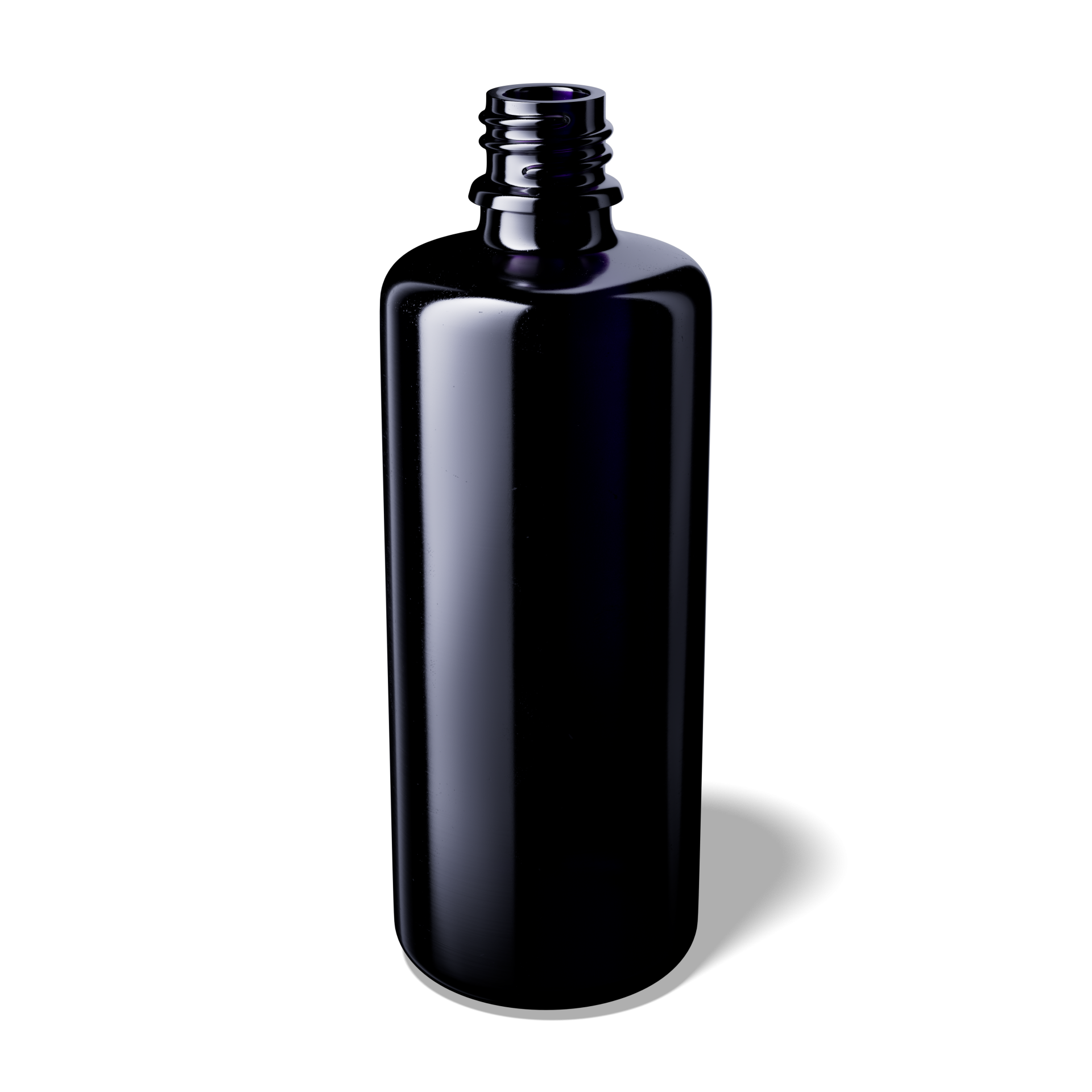 Een violetglazen fles van Miron 100 ml. inclusief dopje met druppelaar. Bewaar hierin je zelfgemaakte oliemix of cleanser.